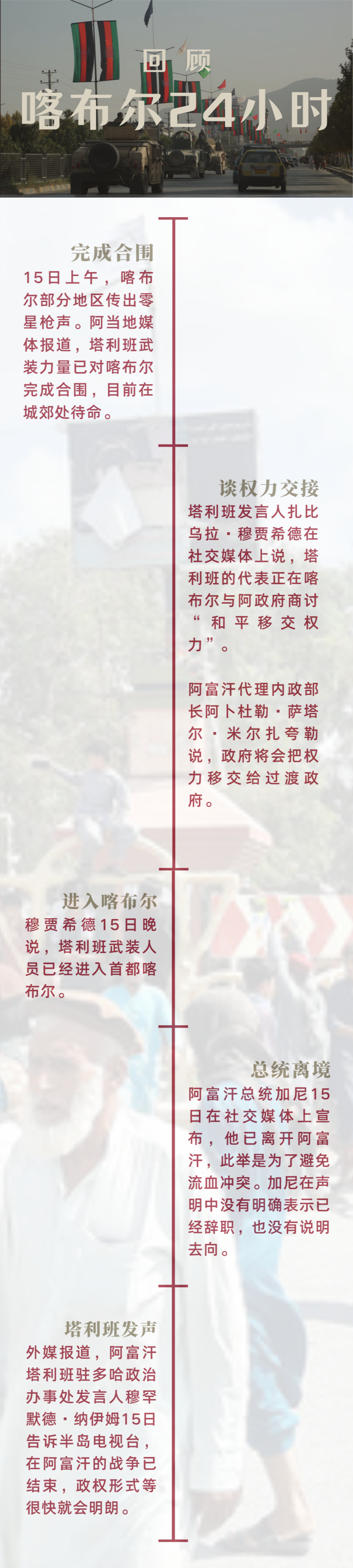 ——塔利班进入喀布尔当天晚些时候,穆贾希德在社交媒体上宣布,由于在喀布尔的阿富汗安全部队已放弃职责、四散而去,塔利班武装人员已进入喀布尔市内,以保障民众安全,维护社会秩序。